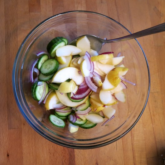 These are more or less the proportions I used for the salad. Adjust as you wish, depending on how much you want to make and what flavors you want to be at the forefront. The amounts for the vinaigrette, however, are accurate. I have given you some optional amounts. It’s pretty simple.
