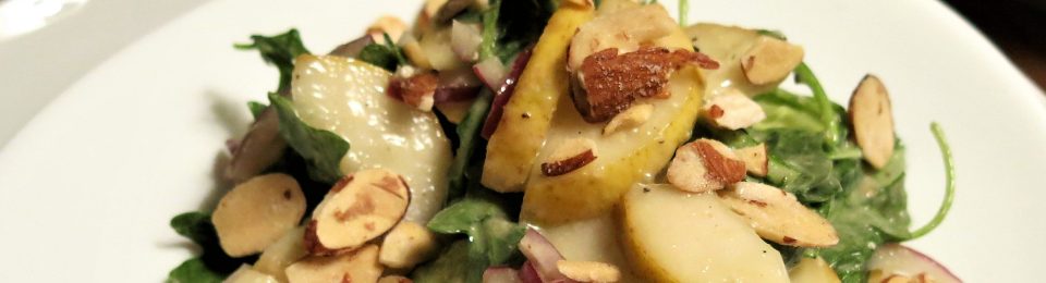 Years ago, when The Goddess was a mere imp, she found a recipe for pears with bleu cheese, all dressed up with a vinaigrette. It was heavenly. This plays off that delicious memory. I remember thinking that pears and vinaigrette was such an odd combination. But, I was young and foolish. I had only eaten pears as fruit or in dessert. It never occurred to me that they could be eaten is such a deliciously savory manner. Thank goodness I checked the back of that salad dressing package. I’ve developed a taste for arugula recently. I’ve always enjoyed arugula as part of a greens mixture, but now, I’m liking them on their own, too.