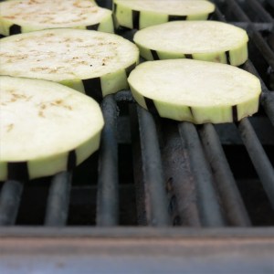 Heat the grill until hot…you should be able to hold your hand over the heat for only a few seconds. Slide the eggplant (on the foil) onto the grate. Close the lid, lower the heat to about medium, and cook for about 15-20 minutes, depending on the heat of your grill. I turned the foil about half-way through cooking, placing the top edge, at the bottom.