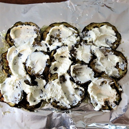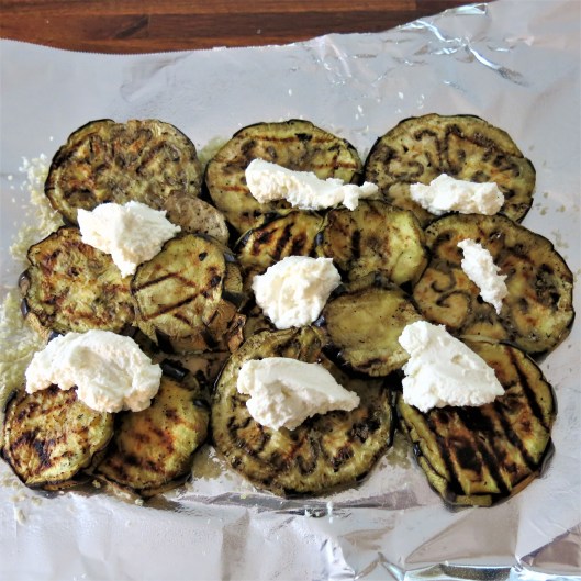 On a double sheet of heavy-duty aluminum foil, about 14X16-inches. I placed the foil on a cookie sheet (without sides), then just slide it onto the grill. Lay the eggplant, overlapping each slice just slightly, in rows…I found three slices down and four slices across, on the foil. Leave at least a 2-inch edge all the way around.