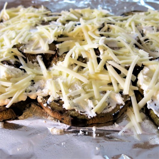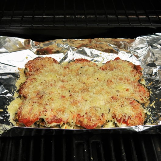 Slide the eggplant (on the foil) onto the grate. Close the lid, lower the heat to about medium; cook for about 15-20 minutes, depending on the heat of your grill. I turned the foil about half-way through cooking, placing the top edge, at the bottom. There should be some bubbling around the edges. When the eggplant is tender, pull the foil back onto the cookie sheet. I found the cheese did not brown particularly well.