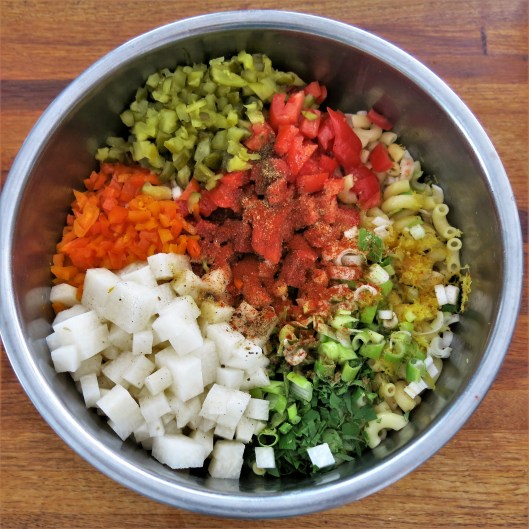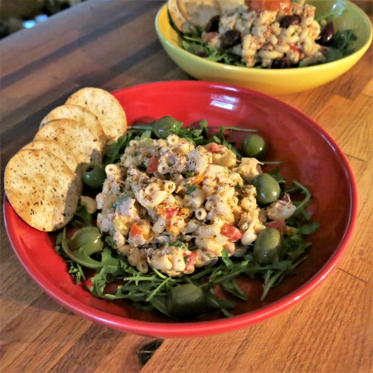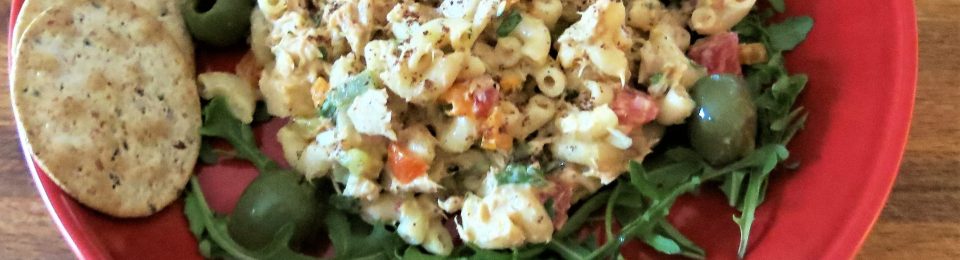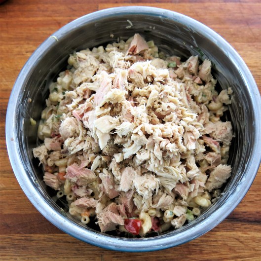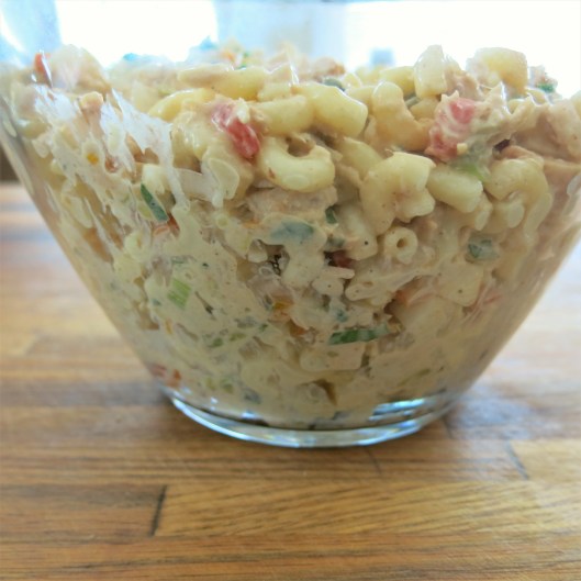 NOTE: I add dry veggies stock to the water when I cook the pasta. It adds both salt and flavor, but isn’t necessary. If gluten is an issue, this works just as well with gluten-free pasta. You may add 5 chopped hard-boiled eggs to the salad, if you wish. Chicken (cooked), imitation crabmeat or cooked shrimp can be used, instead of the tuna.