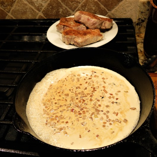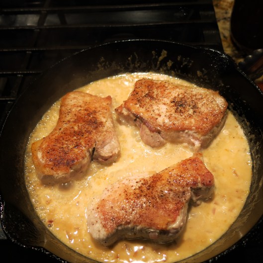 Before we get started, you’ll note that I don’t have pictures of every step…sorry about that, but I think it should be fairly clear. So to begin…first, you will brown/roast the meat…today I used pork chops, so that’s what we’ll talk about for the purposes of this post. Remove the roasted/fried pork from the pan; set aside the meat to rest. I use a cast iron skillet, so it can go right on the burner, while the meat rests. Remove all but about 1 tablespoon of dripping/fat from the skillet. If there is no fat, add butter or oil.