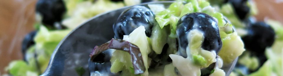 This goes together in a flash and is particularly a nice surprise with grilled pork or beef. It’s stupid simple…cabbage, scallions, celery heart and blueberries in one bowl and tossed together. The dressing ingredients in a second bowl, combine and pour over the salad. Toss to combined thoroughly. I like to add the bleu cheese separately and then toss again. But, feel free to add it to the dressing. That’s it. And, as you can see from the picture, I don’t always follow my own instructions…I just mixed it all together in one bowl…that works, too.