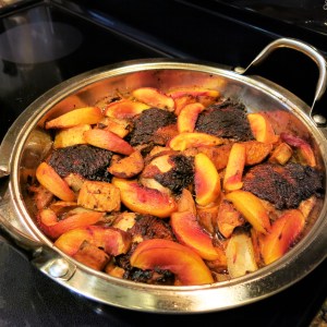 As you know, The Goddess loves fruit with savory things. The spices are the “warm” spices—allspice, coriander, smoked paprika. And nectarines. There isn’t much that’s better than a juicy, ripe nectarine, eaten out of hand, with the juices running down your chin. God, I need a cigarette, just thinking about it. This dish combines the sweetness of nectarines, sweet potatoes and juicy chicken thighs seasoned with those “warm” spices, all in one pan. This is loaded with complex and delicious flavors. The sweet potatoes are a nice addition. The slight sharpness of the nectarines are a good balance for the sweet potato. And guess what? Allspice is great with them, too. This is a really nice end-of-summer dish, and that’s pretty much where we are right now. The warm spices take the chill off. And the nectarines are a nice reminder that summer will come again. This is a one-pan dinner. You can put it together, partially cooked and refrigerate it. Then into the oven, pour yourself a little (or a lot) wine and relax. The spices do get quite dark…frankly they look burned, but they aren’t. I’m giving you the method in pictures.
