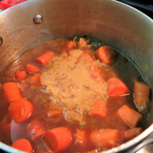 While the vegetables cook, stir together the soy sauce, peanut butter, honey and sesame oil. It takes a little stirring to bring it together, but you want it to be smooth. If you need to, add a little of the broth to thin it out.