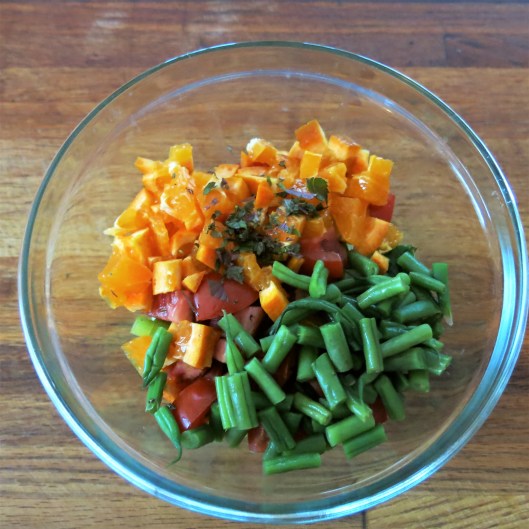 She was thinking salad…she was thinking Mandarin and she was checking her crisper drawer and these are things that just leaped out at her. She started with a Mandarin. She cut a thin slice off both the bottom and top, down to the pulp; less than one-quarter inch. She just diced everything into more or less, pea-sized bits. She diced up a Persian cucumber, about 6 inches of the top of a celery rib, with its leaves, two golf ball-sized tomatoes, some fresh basil and a a couple of mint leaves. Then, she remembered those blanched green beans from the chicken salad she made a couple of days ago. So she cut a small handful into pieces and tossed those in.