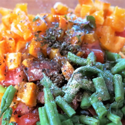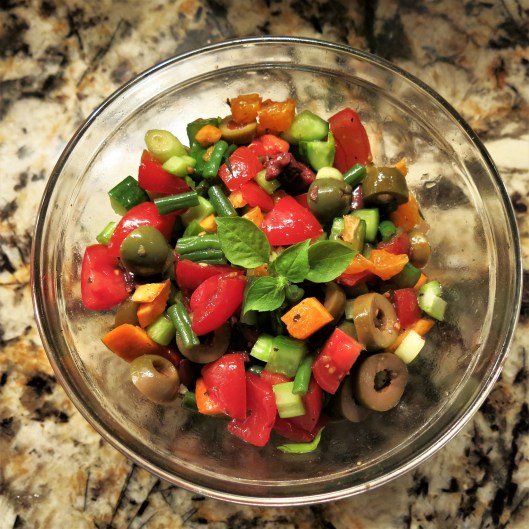 Mandarin, Green Bean, Tomato, Cucumber and Olive Salad Recipe©Marcia Lahens 2020. All rights reserved.