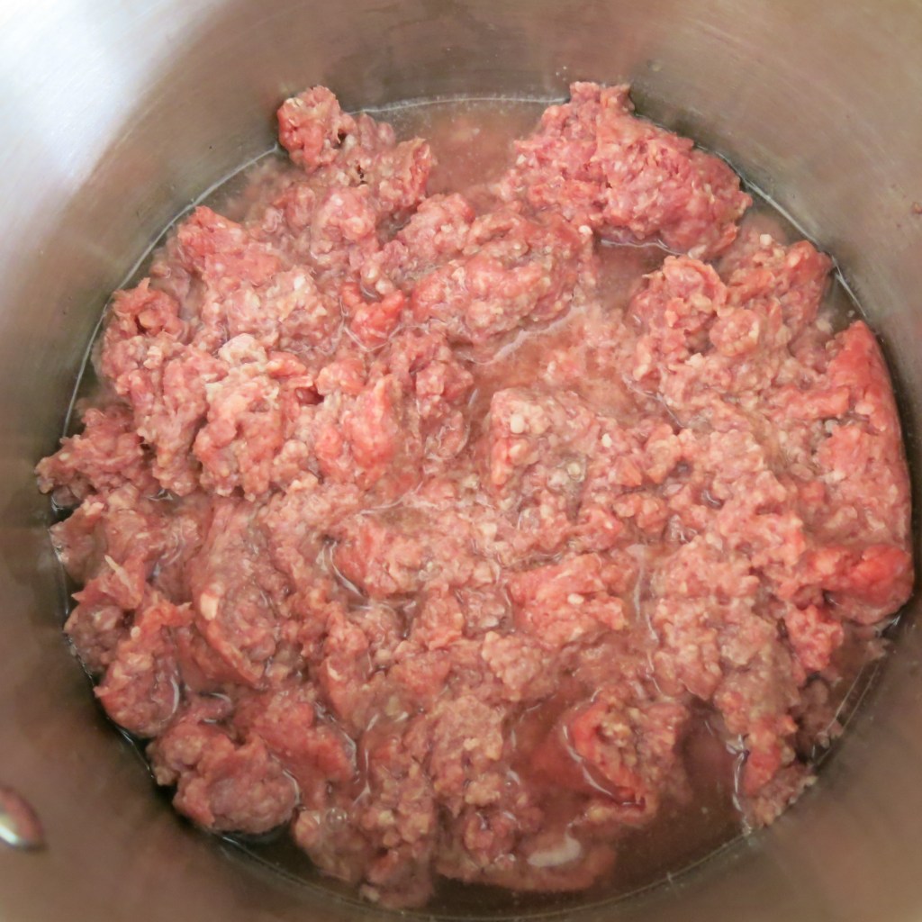 To make the filling–Set a heavy-bottomed saucepan over medium-low heat; add the ground beef and water. Stir the meat and water together; the water will help the meat break up. The meat should be just barely submerged in water. Bear in mind that the meat will release some water as it cooks. Add the bay leaves, pushing them down into the meat. Bring to the simmer and cook the meat for 10 minutes, stirring occasionally.