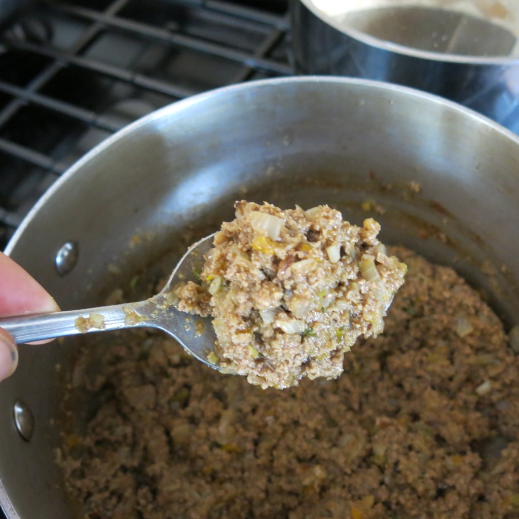 At this point, about half the amount of liquid your started with, should remain. Add in the onion, scallions, garlic, Scotch bonnet pepper, Worcestershire sauce, beef base powder, paprika, black pepper, thyme, curry powder, allspice and MSG, if using. Stir until well combined. Cover and simmer over low heat, for about 10-15 minutes, stirring occasionally. The meat should be very juicy, but not too soupy. Remove from the heat, and stir in the breadcrumbs, adding them slowly, but stirring until thoroughly combined. Again, make certain that the mixture remains moist. Taste and adjust seasonings, if needed. Remove and discard the bay leaves; set aside to cool.