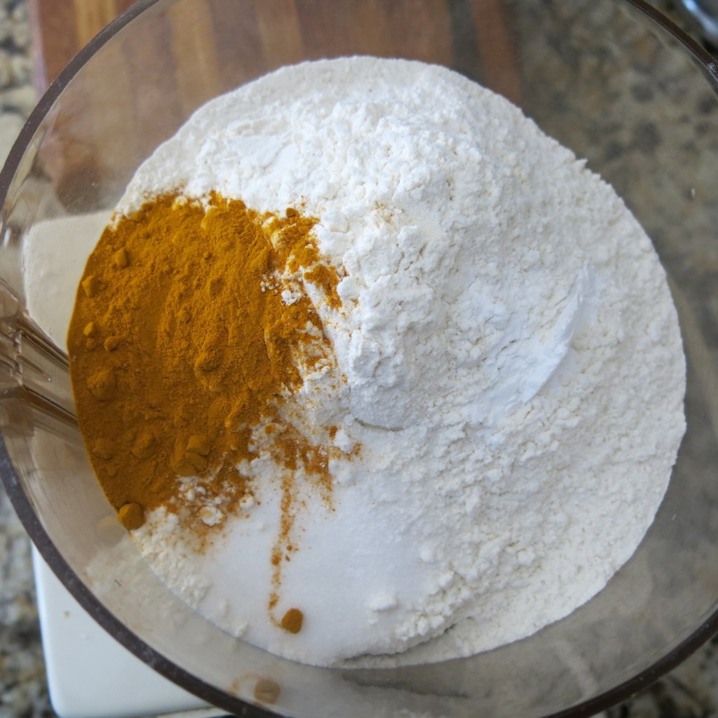 To make pastry–In the bowl of a food processor, combine the flour, sugar, baking powder, salt, and turmeric powder. Pulse 3 or 4 times to combine. Randomly drop the shortening cubes over the flour mixture. Pulse 5 or 6 times to combine and break up the shortening. Combine the vinegar and iced water. With the motor running, pour the water through the feed tube and process just until it comes together, about 8-10 seconds. Remove the dough, form into a round and wrap in plastic. Chill for 30 minutes; an hour or two is even better. This is a relatively soft dough.
