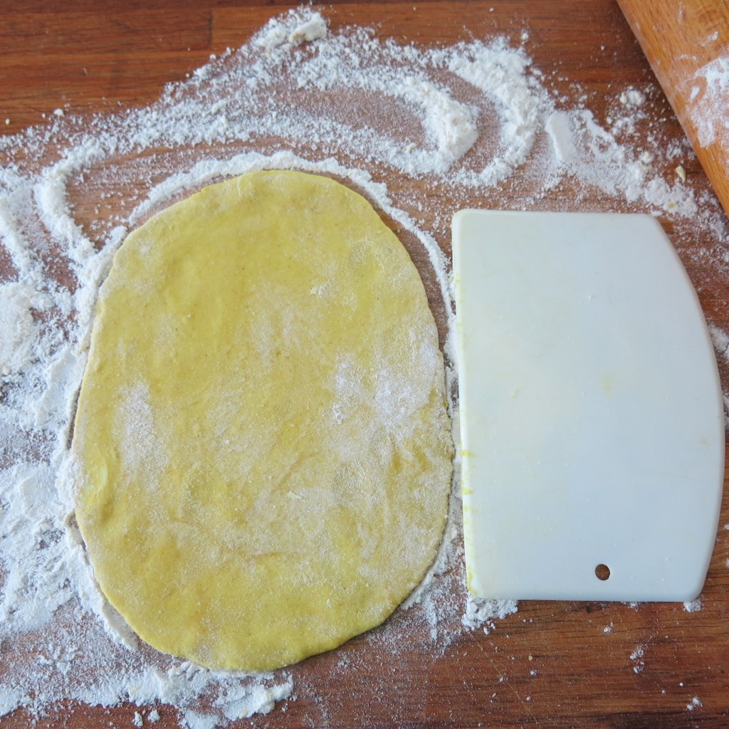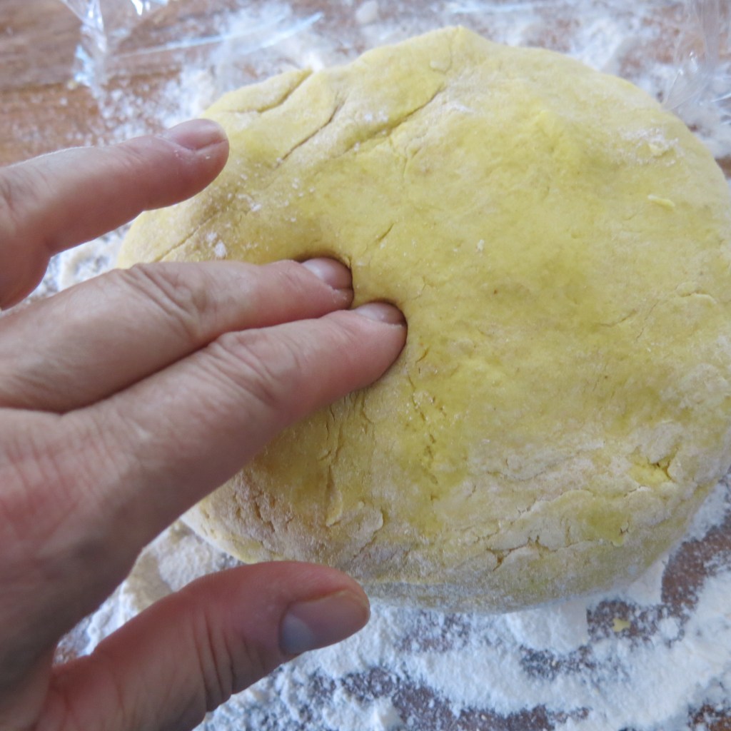 I don’t normally do dough in the FP, but I decided to give it a whirl! I think it worked well, and perhaps I could have added a little extra flour, but after it’s thoroughly chilled, and the blobs are rolled in flour, they rolled out beautifully. They were a bit difficult to handle, but it was manageable.
