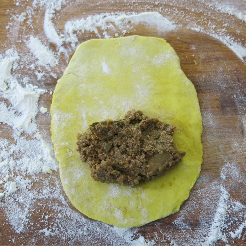 Remove chilled dough from refrigerator. The dough will still be very soft, but it is manageable. Divide it into 12 equally sized balls and flatten slightly. Sprinkle flour on the rolling surface, and using a rolling pin, roll to about 1/8-inch thickness. Place about 3 tablespoons of filling just off the center of the pastry dough. Fold the dough over into a half-moon crescent; seal the edge with water and using a fork, seal the outer edge.
