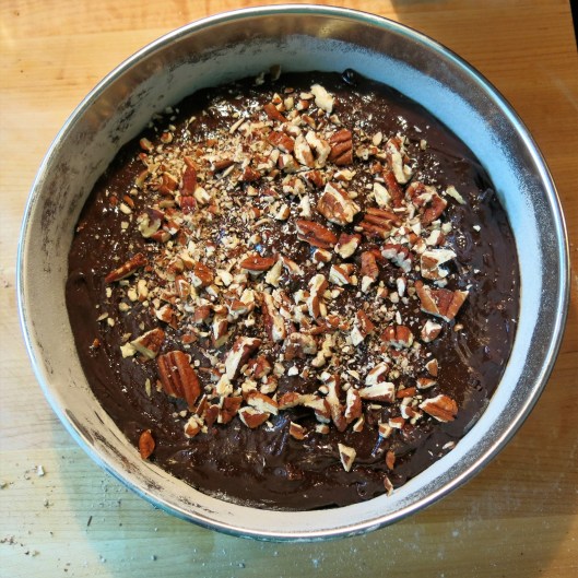pour the batter into a buttered and floured pan. Sprinkle the rest of the pecans over the top. Bake in a preheated 350°F oven for 35-45 minutes…the center should still be slightly soft.