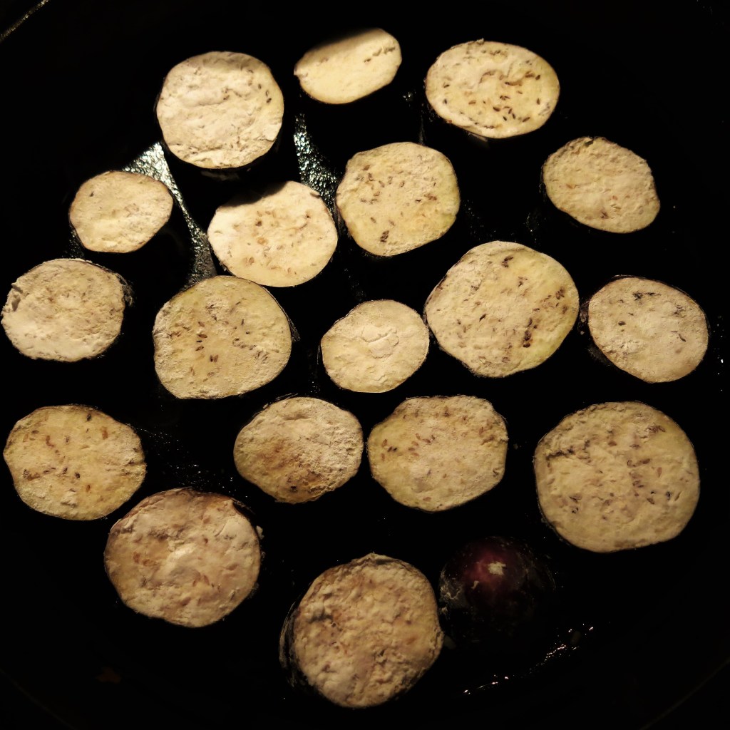 Heat a skillet over medium heat; add the ghee (or oil). When hot, add the eggplant slices, cut-side down. Do not crowd; fry in batches, if necessary. Cook until browned and the eggplant, about 2 minutes per side. Remove to a plate; set aside. The eggplant doesn’t need to be fully cooked.
