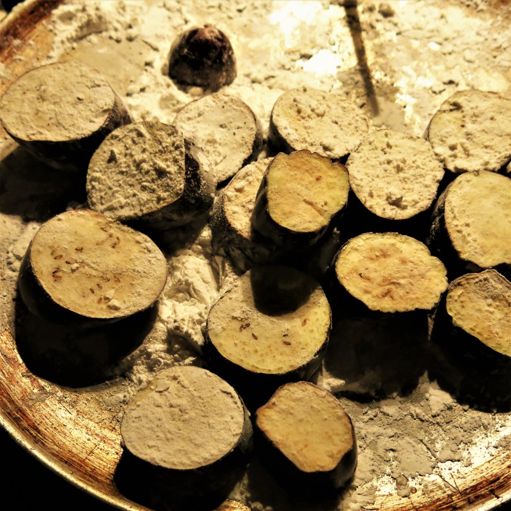 Toss/dust the eggplant pieces with the rice flour. Let stand for about 5 minutes. This helps the rice flour adhere better.