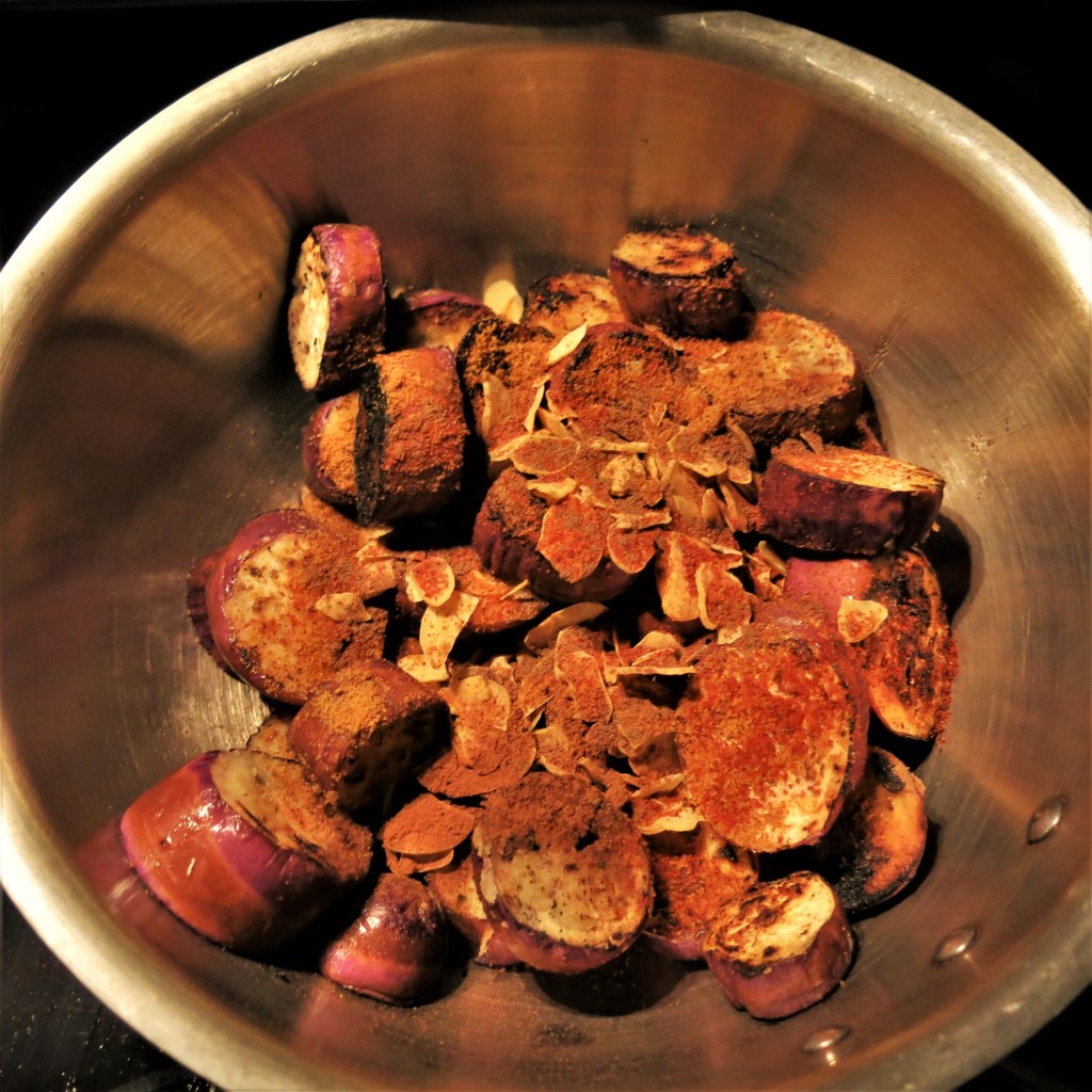 I love eggplant…my favorite ways are usually the way the Asian use them. Salty, sweet with a crispy exterior and a creamy interior…but, then there’s baba ganoush. And the Brazilians serve it simply grilled, with maybe a drizzle of olive oil and vinegar. Okay…so it really doesn’t matter in what cuisine the flavors lay, I’m there for eggplant! I created this because I wanted warm, but subtle spices. Garlic, of course and some onions and mushrooms, too. I had intended for the texture to be firmer, but this turned out to be creamy. I must admit, I am happy with it. Funny how that happens sometimes.