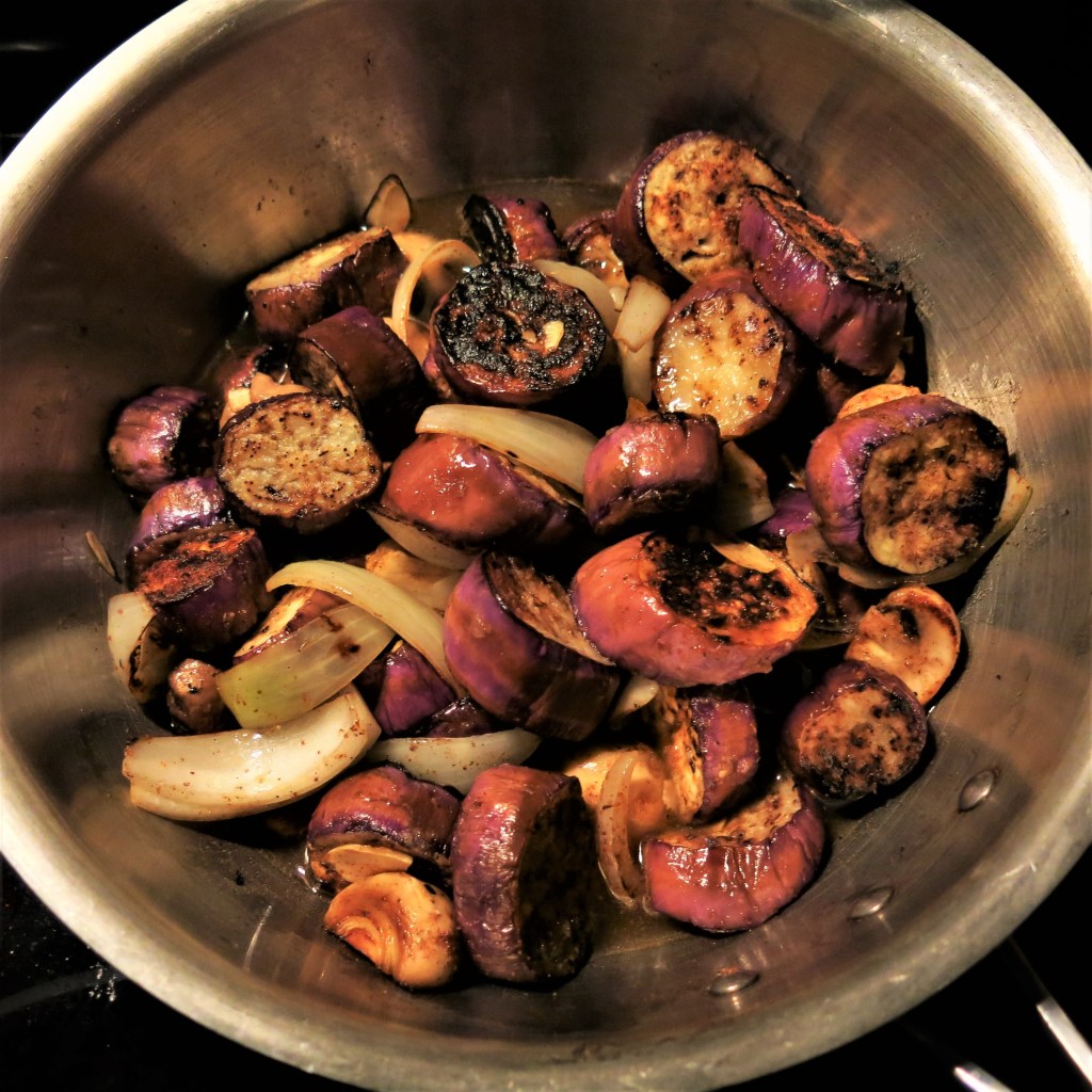 NOTE: You may use “regular” eggplant, but peel, then cut into 1-inch cubes; proceed with the recipe. I find Asian eggplant is firmer than the more common eggplant, so you may need to cook it less.