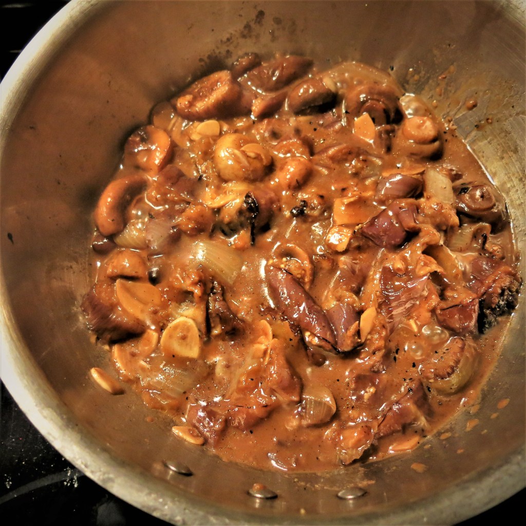 I sauté the mushrooms, brown them up a bit, then toss in the onion pieces and continue to sauté until the mushrooms are relatively tender. I don’t really worry about the onions. We enjoy them crispy or creamy…hey, they’re onions and they are wonderful no matter.