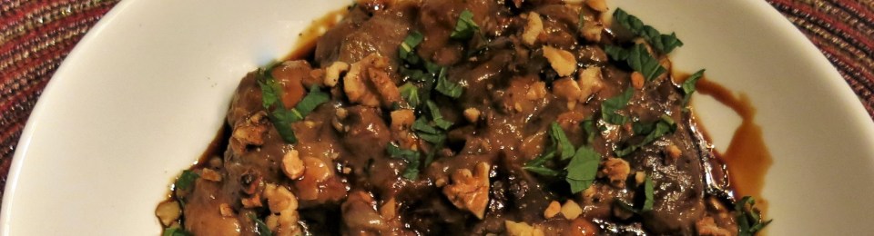 I garnish with julienned mint leaves, toasted walnuts and then drizzle the whole mess with pomegranate molasses. And that’s it…a little bit of heaven!Braised Eggplant with Warm Spices, Walnuts and Pomegranate Molasses