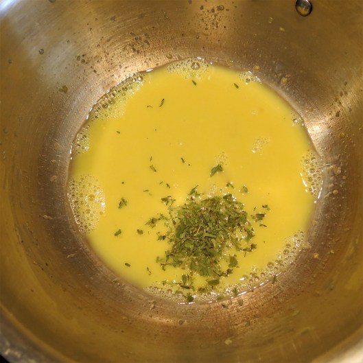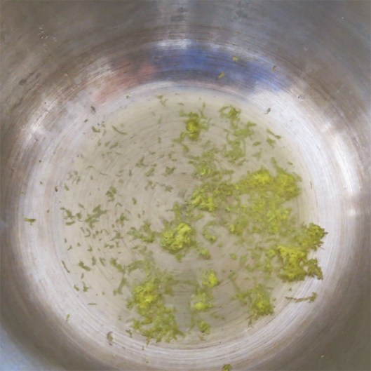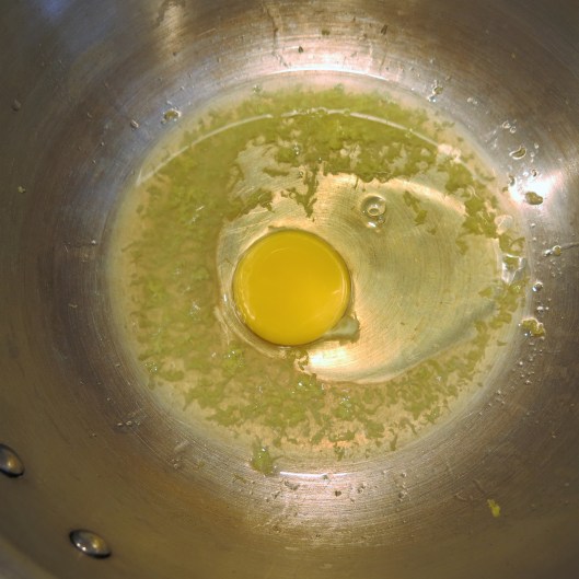 We’re just whisking the egg, lemon juice and zest together until it’s very light and changes color. That’s a bit of tarragon I added, as I like tarragon with eggs. But, that’s up to you.