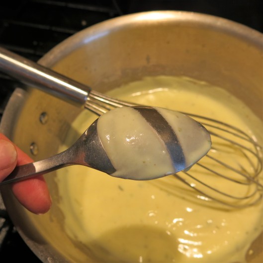 At this point, give the milk mixture a good stir and add about 1/3 of it. Whisk it up well and then add the remainder in thirds, whisking well after each addition. Return to the heat and cook until the mixture coats the back of a spoon and when you draw a finger through it, it doesn’t run. Whisk in the Dijon, if using…and please do. I adds just a nice little tang. Ají amarillo paste (or powder), instead of cayenne is a more interesting “heat”.