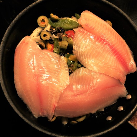 Sicilian cooking is really fusion cooking. The Moors were in Sicily in the 10th and 11th centuries, and they brought all kinds of good things, like, apricots, sugar, citrus, sweet melons, rice, saffron, raisins, nutmeg, clove, pepper, pine nuts and cinnamon. This recipe is sort of an homage to the Moorish presence.One of the best things about this recipe, other than the fabulous flavor, is it’s quick. It’s a perfect mid-week dish, but can also knock the socks off of guests. Unless they’re like me, and always barefooted! But, I digress, yet again. This is a layered affair and what anyone would call a “skillet” dinner, because you can make it in a skillet and bring it right to the table! I used Swai here, but I have used cod and bream, as well. Any whitefish works well. Here it is in pictures…you know that “worth a thousand words” thing!