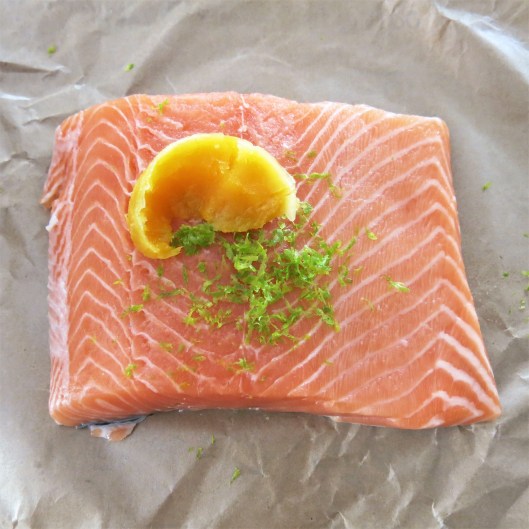 Also, I omitted the tomato this time, because the salmon and it’s sauce are not as compatible with tomato. Also, I used julienned orange zest, as I thought my Mandarin was past its prime.
