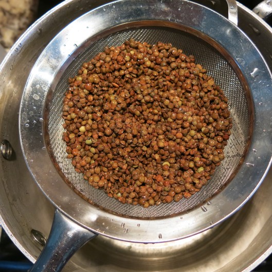 I’m grilling a lovely piece of Norwegian salmon, which I’ve marinated in lime zest, frozen orange juice concentrate and salt and pepper. I thought lentils would be a good backdrop for that, so here we go!