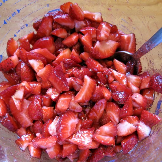 It’s pretty much diced up berries, part of the sugar, lemon juice, the salt and the strawberry gelatin. Stir that all together, and walk away for about 5 minutes. Stir again. I do this for about 20 minutes, stirring every 5 minutes….