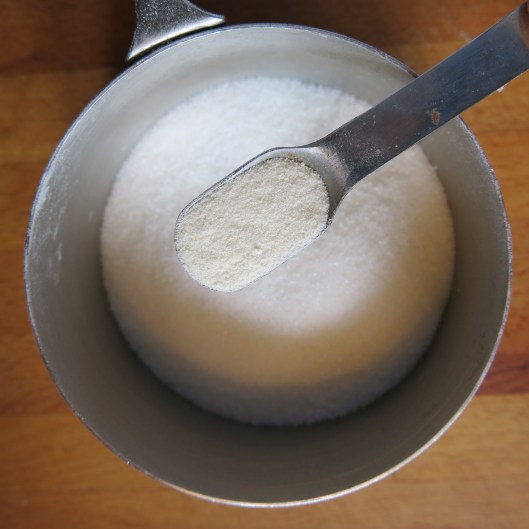 Stir together the remaining sugar, and xanthan gum. Slowly add the sugar/gum mixture, stirring constantly for about a minute or two. You’re adding this V-E-R-Y slowly! Let stand for about an hour. Give it a good stir;