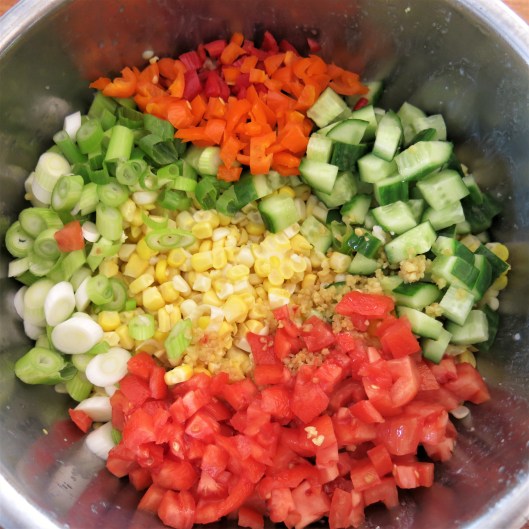 Fattoush with Corn, Tomatoes, Cucumber, Herbs in a Creamy Garlic Dressing Recipe©Marcia Lahens 2021. All rights reserved.