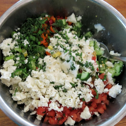 black olives, feta cheese, fresh herbs, mayonnaise, Persian cucumber, pita bread, Roma tomatoes, Scallions, sumac, sweet corn, white balsamic vinegar