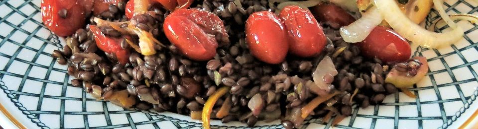I was pan-frying whiting fillets with onions and herb-based compound butter.  I cooked the black barley until it was done and all the liquid was absorbed.  Then, I put that aside.  I decided to sauté a little fresh fennel with the ever-present onion and garlic that The Goddess tends to use with abandon.  I thought about adding celery, but decided the fennel was a better option.  Anyway, I had sliced up a Meyer lemon to add to the fish, but changed my mind and decided to toss it in with the veggies, along with some julienned orange zest (from an orange that had seen better days). Normally, I would have tossed in some fresh herbs—rosemary, thyme and maybe parsley.  But, since I had that herb-butter for the fish, I made an executive decision and omitted them.  And lurking in the very, very far reaches of my little brain, was the idea to use the leftover pilaf for a salad…and I wanted to add spices to that.  So, no herbs…this time around.  When the veggies were translucent, I lowered the heat, added the whole cherry tomatoes, popped the cover on and cooked them for about 4-5 minutes, stirring now and again.  I wanted them to remain whole…or most of them to be whole.  That’s it…return the cooked black barley to the pot, add some salt and pepper (taste first!) and serve!