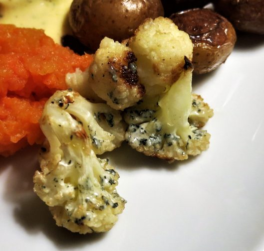 That’s it. That’s all there is to it. If I’m feeling in the mood for creaminess, I pour a good quality bleu cheese salad dressing over it. In the summer, feel free to do the roasting on the grill, if you don’t want to heat up your kitchen. I just put a triple thickness of foil directly on the grill, toss the cauliflower and fat together in a bowl and then dump it on the foil when the grill is hot. Screaming heat is the best way to cook cauliflower for something like this. No heat in the kitchen, so it’s good for a hot summer night.