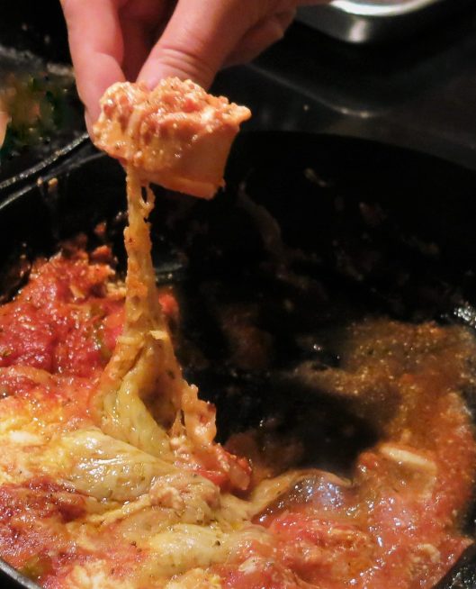 What? Has The Goddess been smoking herbs again? You might think that, but this came to be because she forgot to make pizza dough. And anyway, this is pretty much pizza, cooked in an oven-to-table pan, finished in the oven and served with good Italian bread to scoop up all that yumminess. So, it’s pizza, without a crust.