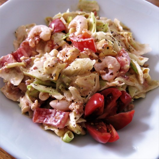 This is a throw-back to my childhood. On hot summer days (we didn’t have air-condition!), when my mother didn’t want to heat up the kitchen, she would make this in the morning, and put it in the fridge. At dinner time, she would add it to chopped iceberg lettuce, along with thawed frozen peas. It was so very good, at the end of a hot day.