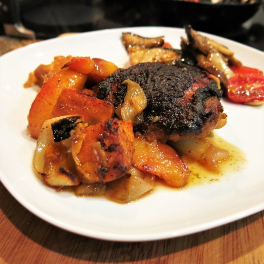 As you know, The Goddess loves fruit with savory things. The spices are the “warm” spices—allspice, coriander, smoked paprika. And nectarines. There isn’t much that’s better than a juicy, ripe nectarine, eaten out of hand, with the juices running down your chin. God, I need a cigarette, just thinking about it. This dish combines the sweetness of nectarines, sweet potatoes and juicy chicken thighs seasoned with those “warm” spices, all in one pan.