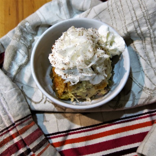 This is different from the bread pudding I usually make. It’s less dense and while it’s custardy, it isn’t overly custardy. Does that make any sense at all? Quite awhile back, when we could still dine out, The Goddess brunched at